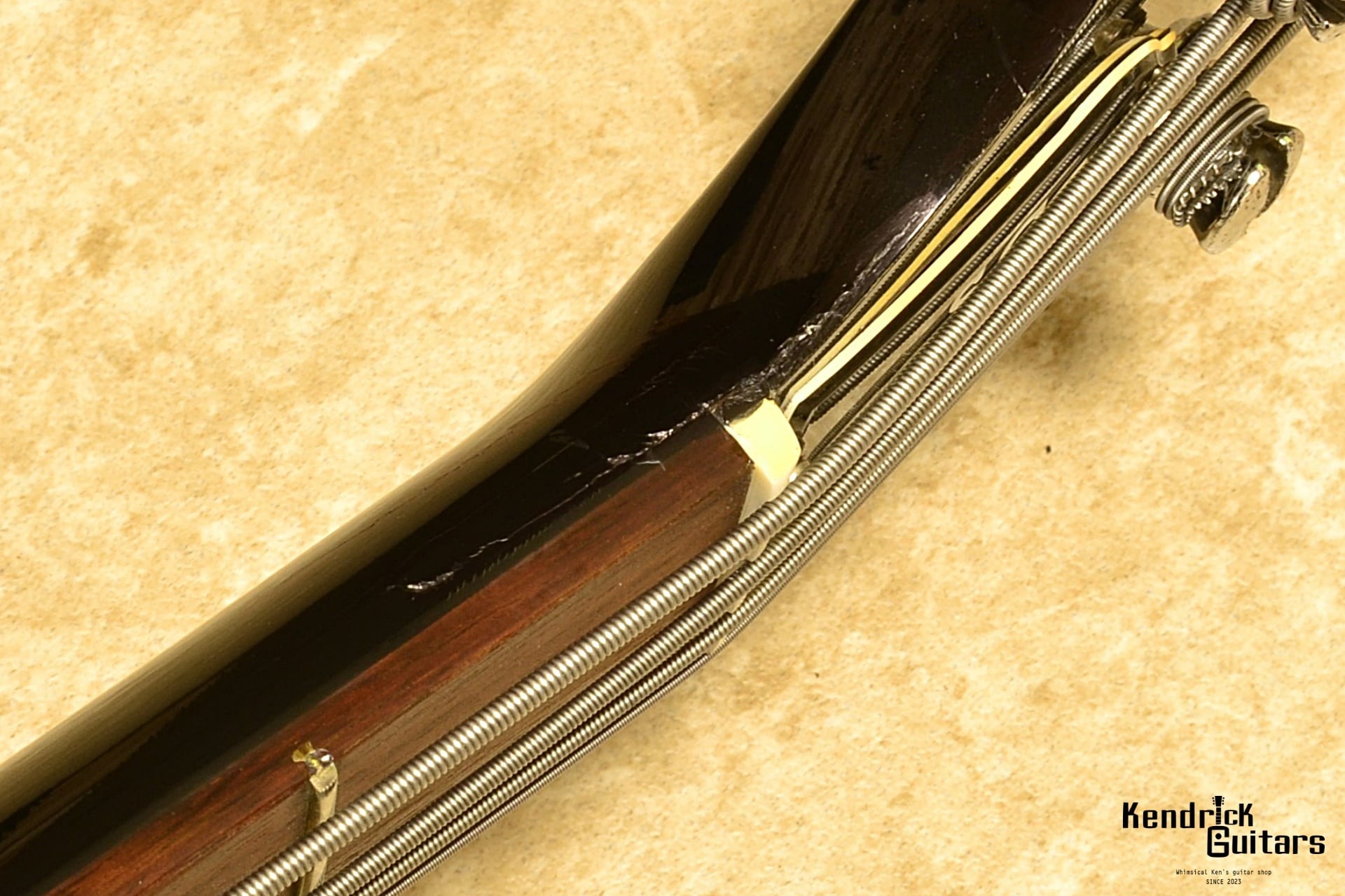 ネック上部両側にクラックがありますが、弊店で丁寧にオーバーホールを施しましたので、楽器としてのコンディションは抜群です。